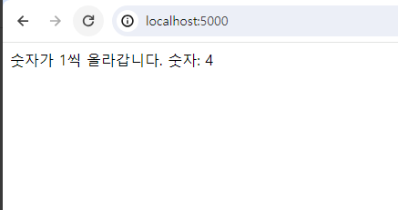 그러면 새로 고침 할 때마다 숫자가 올라가는 걸 확인할 수 있다. 만약 오타가 있어서 다시 빌드를 하고 싶다면 docker-compose up --build 명령어를 입력하면 처음부터 다시 빌드를 할 수 있다.