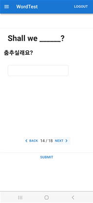 시험은 세 유형으로 나오게 했는데 영어 단어 보고 뜻 맞추기, 뜻 보고 영어 단어 맞추기, 예제 보고 빈칸에 들어갈 영어 단어 맞추기, 이렇게 3가지가 있다. 한 단어가 한 유형에 고정 되는게 아니라 시험을 볼 때마다 랜덤으로 달라지게 했다.