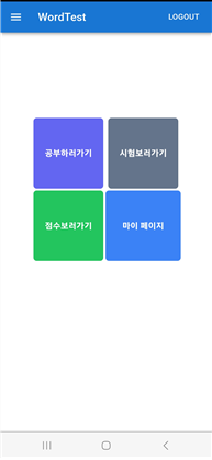 먼저 메인 페이지. 이건 모바일 용 페이지이고 웹 페이지 용도 따로 있다. 기능은 크게 영어 공부, 시험, 점수, 마이페이지(로그인, 회원가입) 이렇게 네가지가 있다.