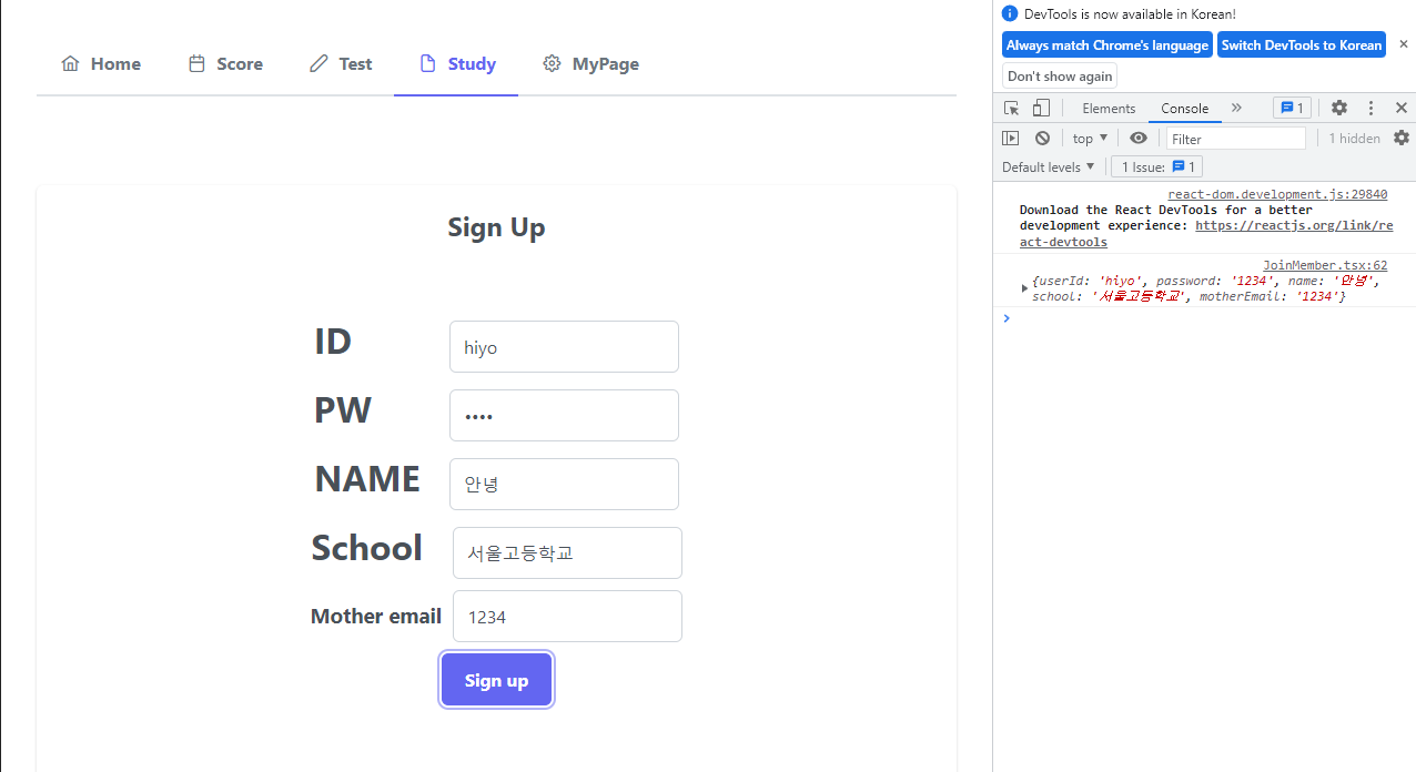 현재 회원가입 기능 구현 중에 있는데 이렇게 아이디, 비밀번호, 이름, 학교, 부모님 이메일을 입력 받아야 한다. 즉 만약 onChange 함수를 따로 만들어주면 총 5개를 만들어야 되고 입력 받아야할 항목이 늘어날수록 코드는 기하급수적으로 늘어날 것이다. 따라서 하나의 함수로 하나의 state에 모든 값을 담아야 한다.