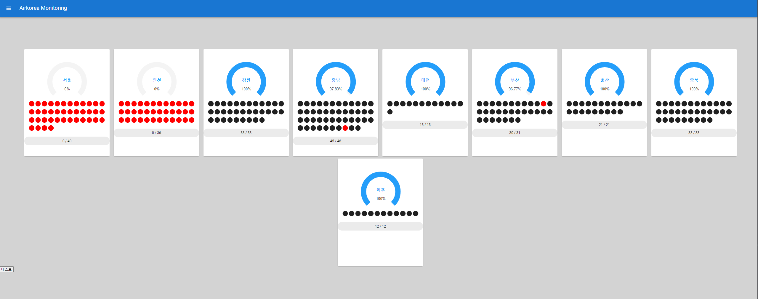 위 사진 처럼 일단 지역정보를 불러오고 그 지역에 있는 측정소 정보도 불러오고 그리고 해당 시간대에 수집된 데이터도 불러와서 이상이 있는지 없는지 체크해서 이상이 있으면 빨간색으로 표시를 해줘야 했다. 그런데 이 메인페이지를 한 번 보려면 3~5초 정도의 시간이 걸렸다. 수집된 데이터 테이블의 데이터가 시간이 지날 수록 계속 수집해서 쌓이기 때문에 발생하는 문제였다. (처음 개발할 때에는 데이터가 많지 않았기 때문에 이렇게 오래 걸리지 않았다고 한다.) 아무리 사내에서 모니터링용으로 쓸 거라지만 이건 좀 아닌거 같아 이 모니터링 페이지를 동기와 함께 마이그레이션 해본다고 말씀 드렸고 신기술 연구 겸 프론트엔드는 React, 백엔드는 NestJS를 통해 개발하기로 하였다. DB 구조나 쿼리도 싹 갈아 엎고 싶었지만 그건 제지 당했다..(왜냐하면 기존 코드는 model.attribute로 넘겨서 jsp에서 jstl로 받는 구조에 적합하게 짜여있었고 노드를 사용하면 그럴 필요가 없었다. 근데 거절..ㅋㅋㅋ) 물론 신기술 도입으로 진행하는 프로젝트이니 일단 한 번 기능을 먼저 구현해보고 나중에 리팩토링하라고 하시긴 했다. 퇴사해서 못했지만...ㅋㅋㅋ