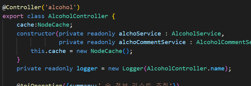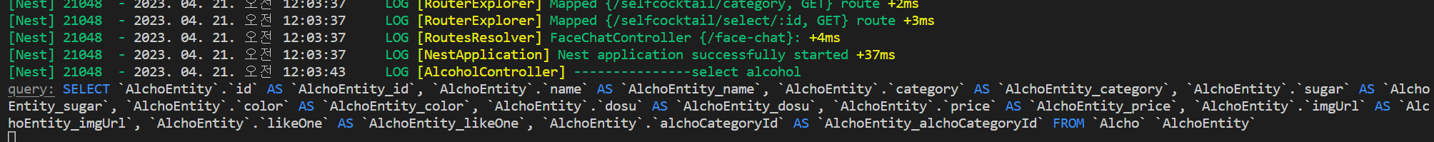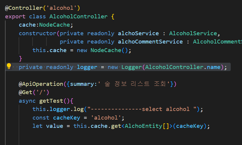 해당 컨트롤러는 localhost:5000/alcohol 요청이 들어왔을 시 ---------select alcohol이라는 로그를 남긴다.