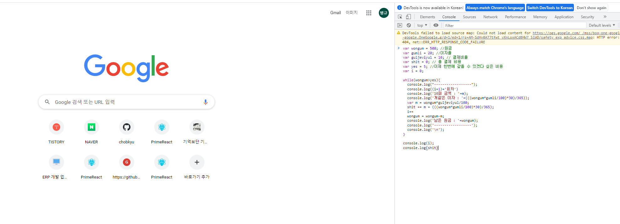 웹 편집기에 돌렸더니 이유는 모르겠지만 밑에 console.log 부분이 잘린다. 출력할 수 있는 부분에 한계가 있나 싶어서 개발자도구를 켜고 직접 실행해보자. 어느 웹 페이지에든 브라우저를 키고 F12를 누르면 개발자도구가 나오는데 거기서 Console 창에서 실행하면 된다.