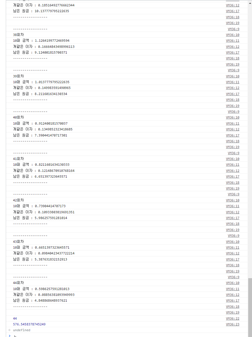 그래서 남은 원금이 yes 보다 작아질 때까지 반복문을 돌린다. 한 번 돌 때마다 이자 + 10퍼센트 결제 비용이 shit 변수에 더해진다. 그럼 내가 총 얼마를 냈는지 알 수 있다.