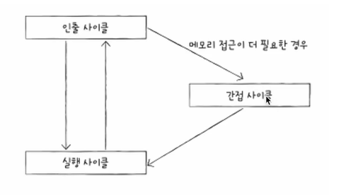 식으로 이루어진다. 이 때 어떤 명령어는 인출과 실행 사이클만으로 실행되지만 어떤 명령어는 메모리 접근이 더 필요한 경우 간접 사이클을 거쳐 실행된다.