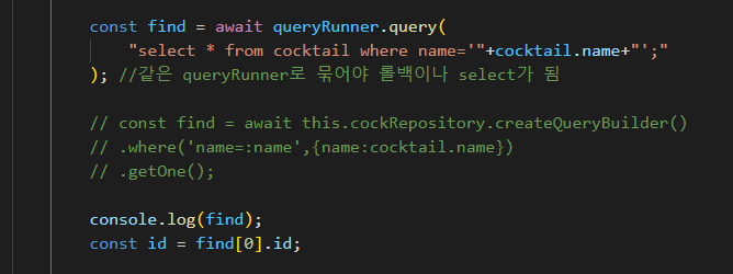 그리고 해당 데이터를 다시 조회 하기 위해 select 작업을 진행했다. 이 때 commit 이 된 상태가 아니기 때문에 다른 repository로 쿼리를 날리면 데이터를 select 하지 못하기 때문에 queryRunner로 직접 쿼리를 날렸다.