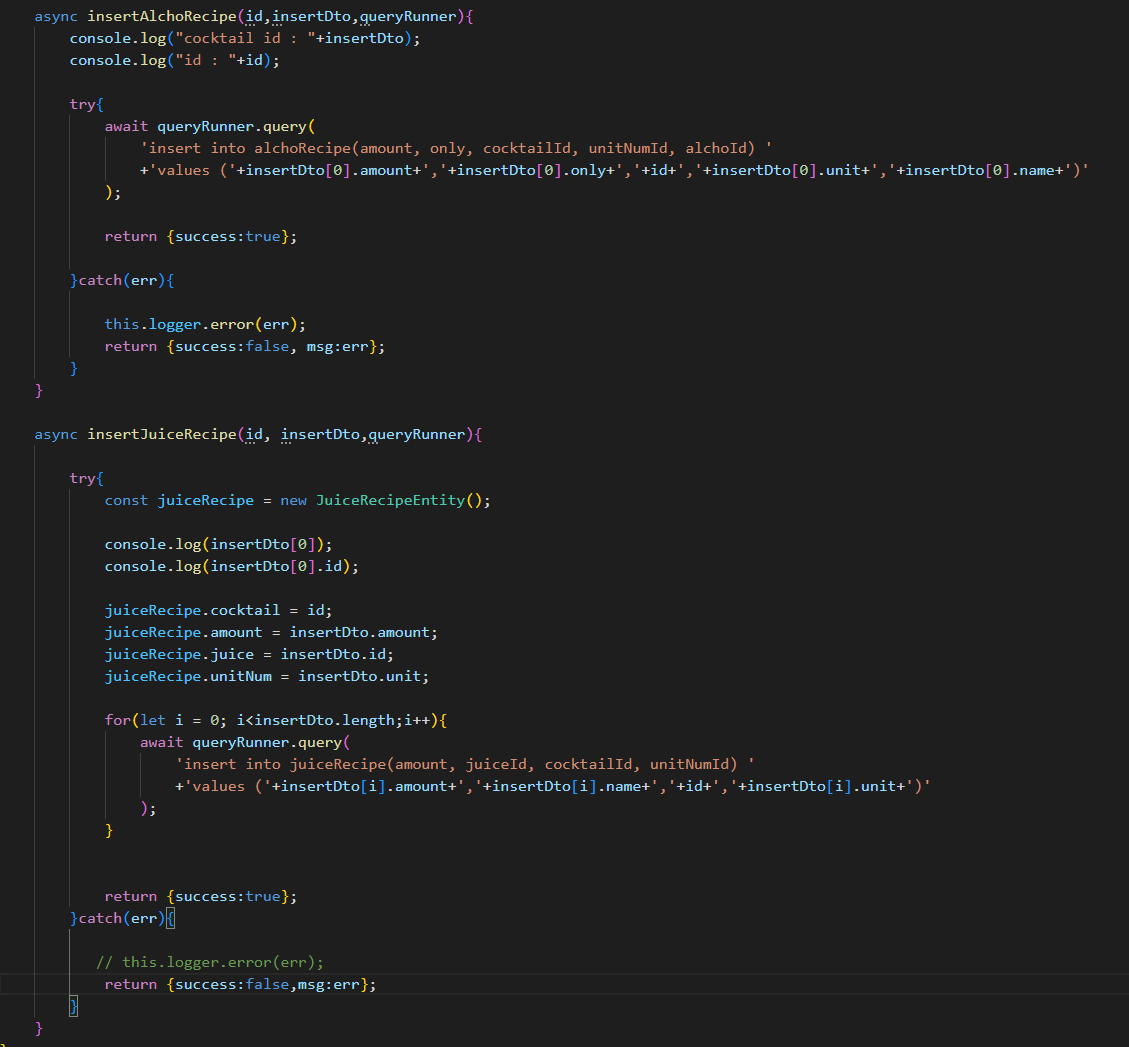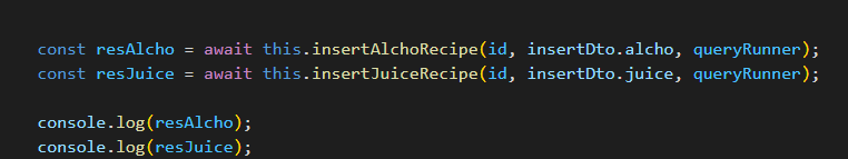 위에서 select한 id 값을 사용하여 각각 다른 테이블에 insert 작업을 해주었다. 하나의 트랜잭션으로 묶여야하기 때문에 queryRunner를 인자로 전달하여 각각의 쿼리를 수행하였다.
