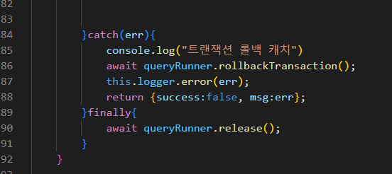 그리고 해당 insert 작업이 실패했을 시에 rollback 할 수 있도록 catch 문을 작성한다. 그리고 queryRunner를 생성한 뒤엔 꼭 finally 문을 통해 queryRunner.release()를 해줘야 한다.
