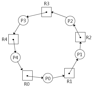 - 원형 대기 : 프로세스들이 원의 형태로 자원을 대기하는 상태