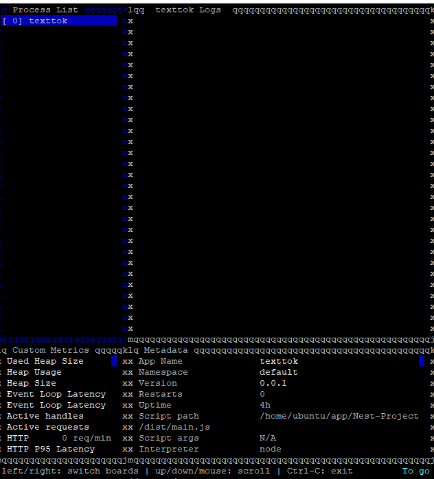 그리고 모니터링을 하고 싶다면 pm2 monit이라는 명령어를 입력하면 되는데 이러면 각 프로세스의 메모리, CPU 사용률, 현재상태, 선택된 프로세스의 로그, 전체 프로세스의 Heap 사이즈 및 사용률, 어플리케이션 정보 등을 볼 수 있다.
