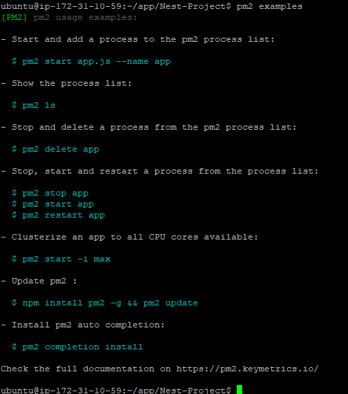 다른 명령어를 확인하고 싶다면 pm2 examples 명령어를 실행하면 된다.